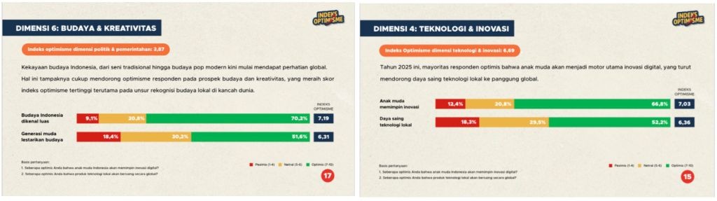 Meski banyak tantangan, dua dimensi tetap mencatat skor tinggi: Budaya dan Kreativitas (6,75) serta Teknologi dan Inovasi (6,69). Keduanya masuk dalam kategori “optimis”. Sebanyak 70,2% responden optimis budaya Indonesia akan semakin mampu dikenal di kancah global, dan 66,8% yakin anak muda mampu memimpin inovasi digital.