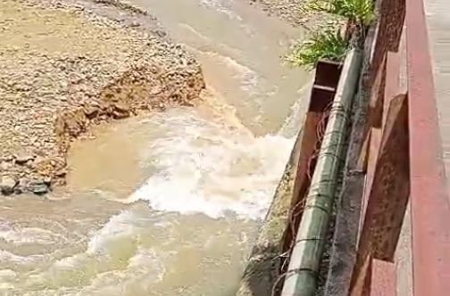 Air sungai yang seharusnya mengairi sawah kini berbelok masuk ke lubang pondasi yang rusak, menyebabkan suplai air irigasi terhenti total.