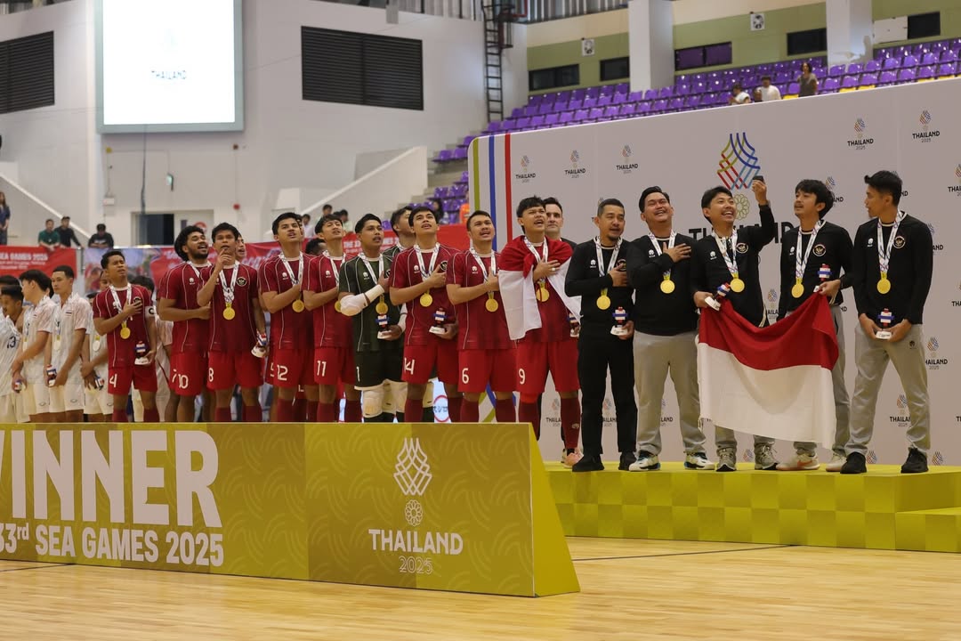MENTAL JUARA. Skuad Timnas Futsal Indonesia merayakan keberhasilan meraih medali emas SEA Games di Bangkok, Thailand, Minggu (22/12/2024). Di bawah asuhan pelatih Hector Souto, tim Garuda tampil disiplin dan kolektif sepanjang turnamen hingga menjadi yang terbaik di Asia Tenggara. (Foto: Federasi Futsal Indonesia)